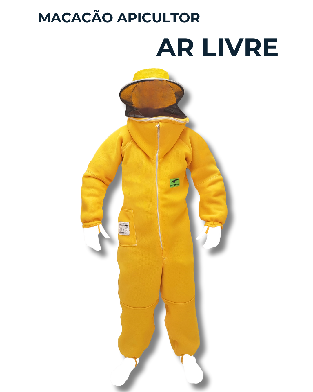 O macacão é 100% poliéster, com dupla camada de malha livre e costura tripla, aumentando significativamente a vida útil. É antiferroada e não retém ferrões, evitando a morte de abelhas.